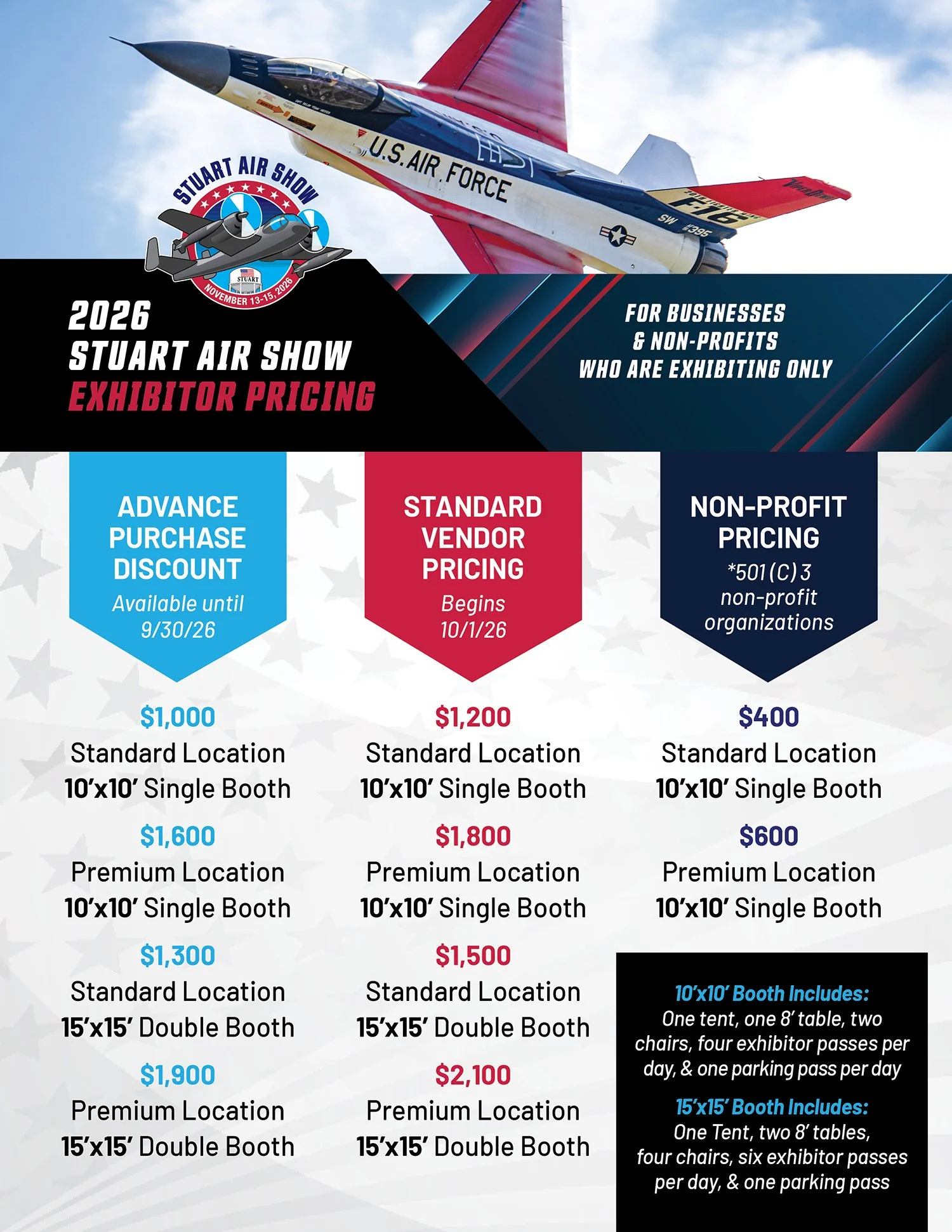 Put your brand in front of thousands of engaged spectators and aviation enthusiasts, become an exhibitor or vendor at the 2026 Stuart Air Show and be part of one of the Treasure Coast’s most anticipated community events. Please fill out the online form or email us at operations@stuartairshow.com